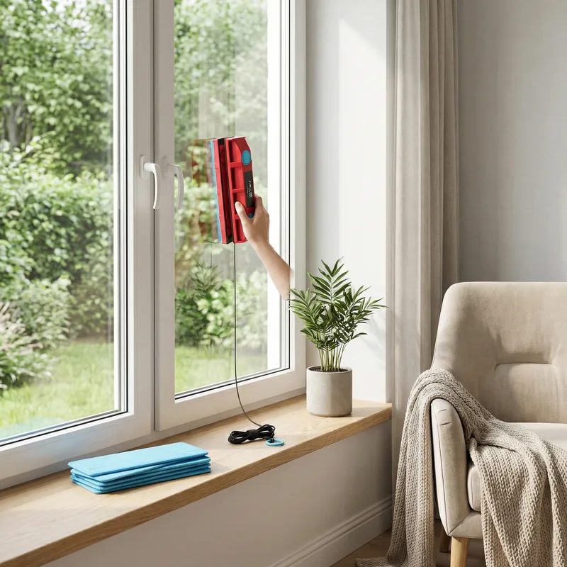 Städkungens fönstermagnet putsas båda sidor av fönstret samtidigt utan att öppna det — perfekt för höga fönster eller fönster som sitter fast. Den kraftiga N52-magneten håller de två delarna synkroniserade för jämnt tryck mot glaset.